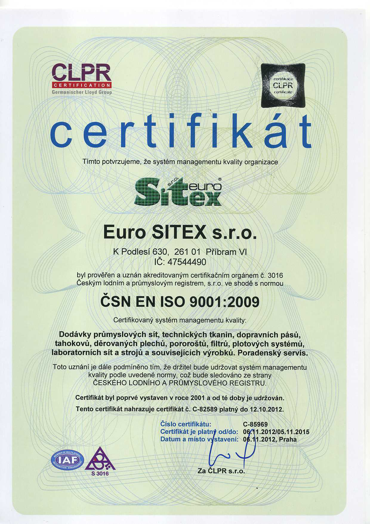 Sabiedrība Euro SITEX s.r.o. tiecas dokumentēt visus firmas procesus, kas iespaido izstrādājumu un pakalpojumu kvalitāti, un tāpēc 2001. gadā tā saņēma kvalitātes sertifikātu ЧСН ЕН ИСО 9002, kuru izsniedza Čehijas kuģu un rūpniecības reģistrs Prāgā. Kvalitātes sertifikācijas sistēma darbojas attiecībā uz visu izstrādājumu piegādi un konsultatīvo pakalpojumu sniegšanu. 2002. gadā sertifikācija tika paplašināta uz normas ЧСН ЕН ИСО 9001:2001 rēķina.